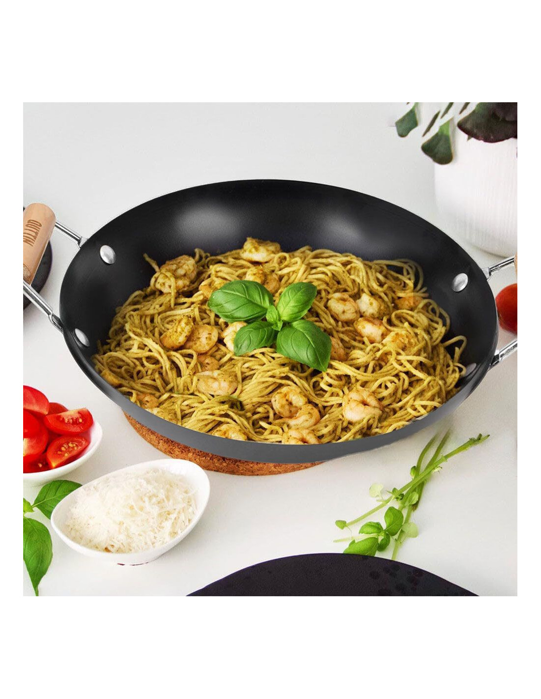 Wok de 30 centímetros, amplio y robusto, con un revestimiento antiadherente que garantiza una cocción suave. Sus dos asas de madera no solo son ergonómicas, sino que aportan un toque natural y elegante. Es perfecta para saltados, y su diseño versátil encaja en cualquier cocina.